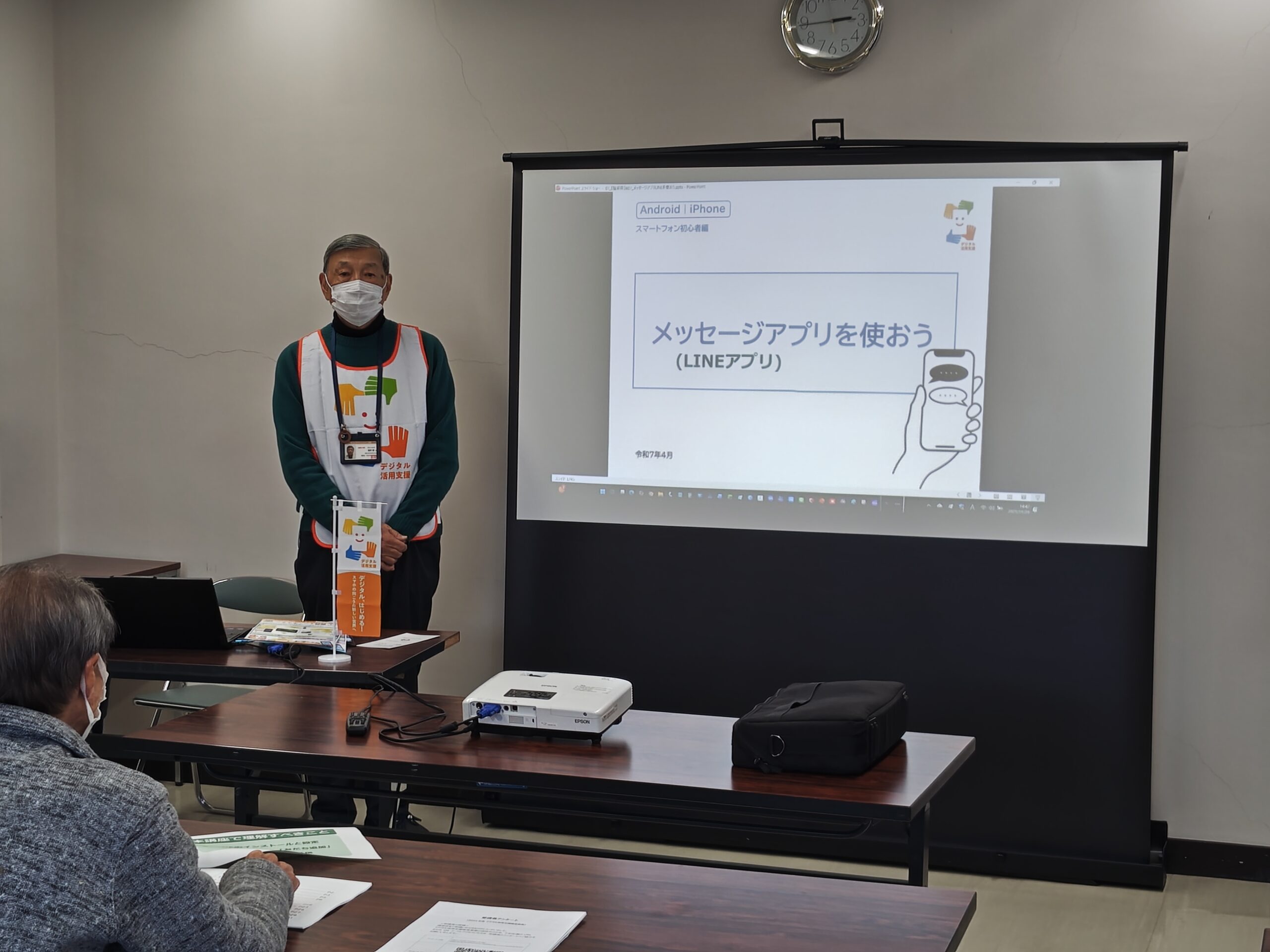 「メッセージアプリ(LINE)を使おう」では、LINEでのお友達追加、メッセージや写真の送付方法を実習していただきました。さすがに、すでにLINEを使っておられる方が多く、多くの質問が寄せられ、受講者にとっては有意義な講座になったと思います。