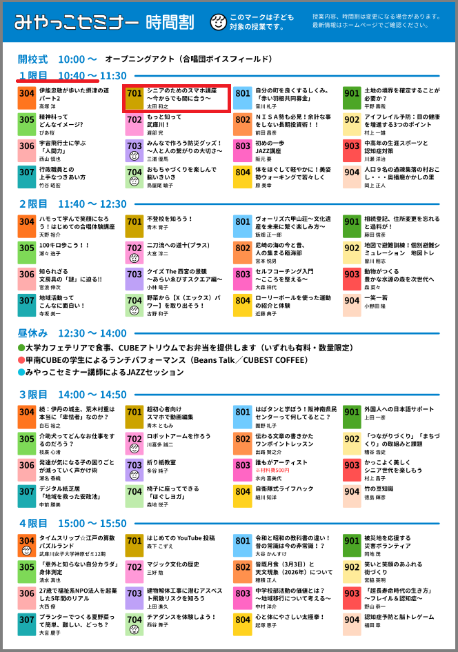 今年も西宮市で開催される「みやっこセミナー2026」にて「シニアのためのスマホ講座」に登壇します。